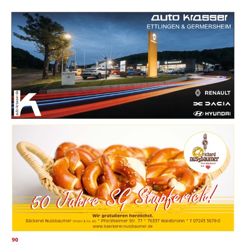 ETTLINGEN & GERMERSHEIM auto-krasser.de 50 Jahre SG Stupferich! 50 Jahre SG Stupferich! Wir gratulieren herzlichst. Bäckerei Nussbaumer GmbH & Co. KG * Pforzheimer Str. 77 * 76337 Waldbronn * T 07243 5678‑0 www.baeckerei‑nussbaumer.de 90